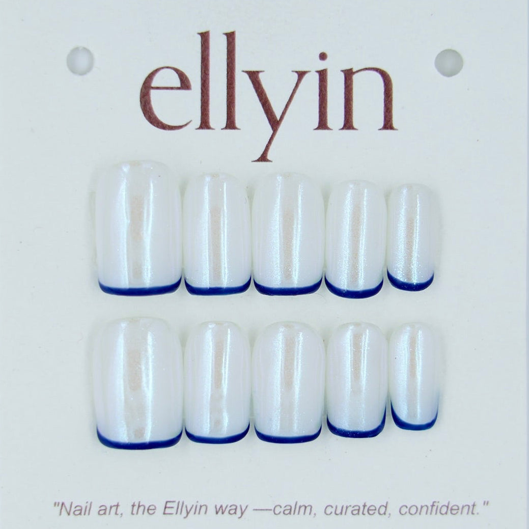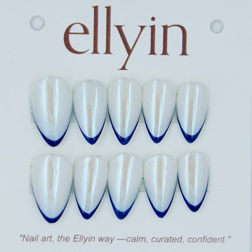 Clean lines. Cool tones. Futuristic finish. The Ellyin Blue Chrome French Press-On Nails combine a pearl-white chrome base with sharp cobalt-blue French tips — a set designed for subtle drama and minimalist expression.