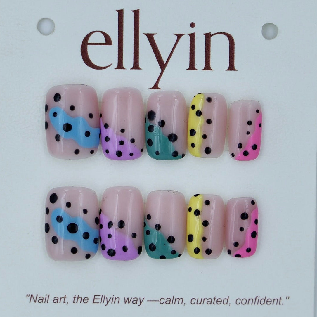 Each nail features a unique combo of blush bases and vibrant shades like lemon yellow, sky blue, and lilac — dotted with jet-black spots that scream personality.