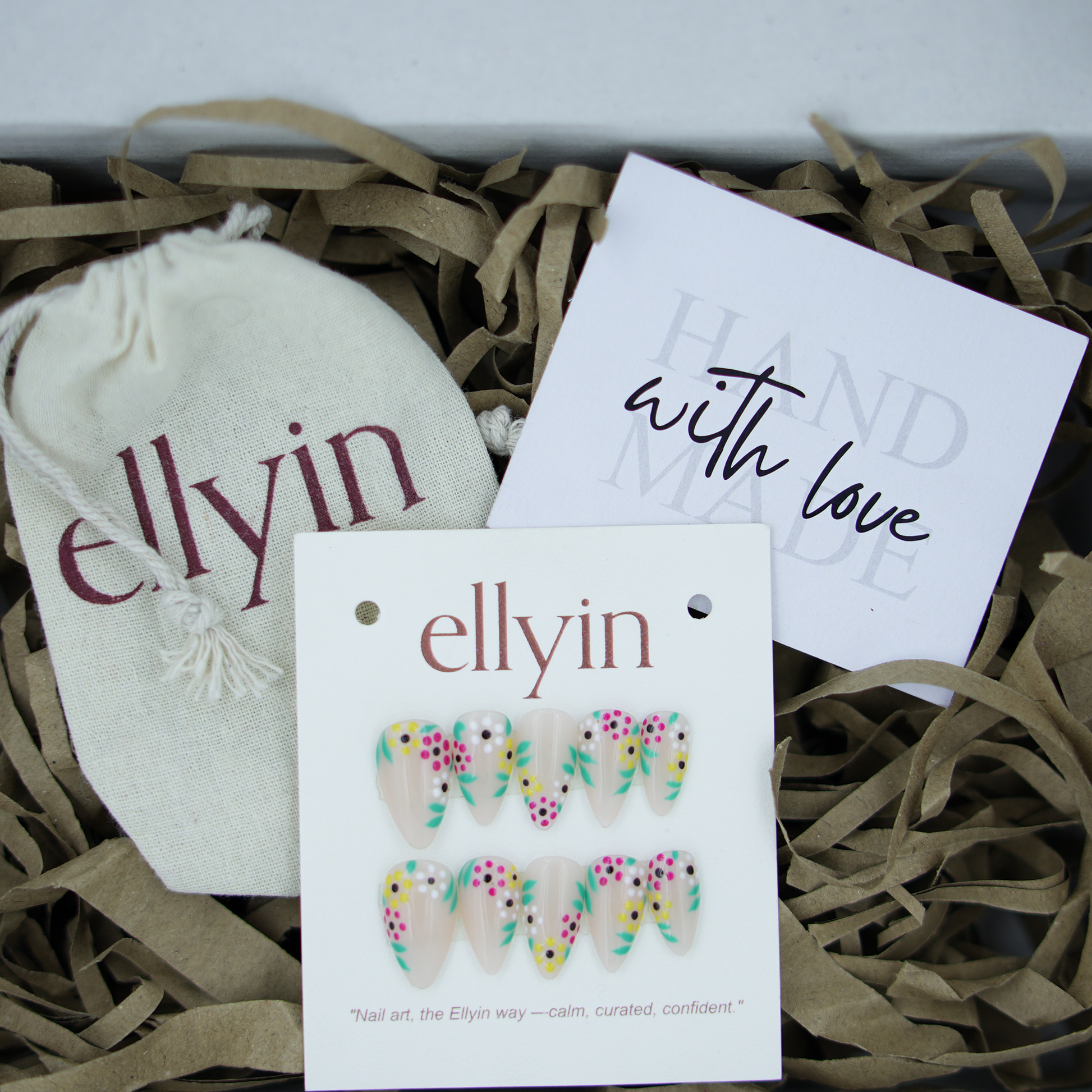 Every Ellyin press-on set is handcrafted by artists — with warmth, care, and detail in every design.