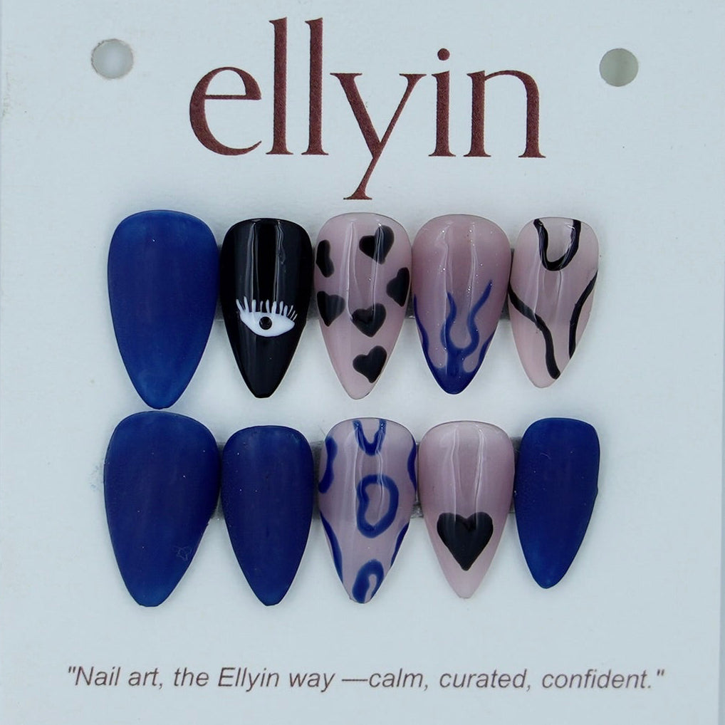 Mystic eyes, heart-shaped sparks, electric blues, and fluid lines — Midnight Spell casts a cool-toned charm with every glance. This eclectic set blends matte cobalt, glossy noir, and nude bases for a vibe that’s both edgy and ethereal.