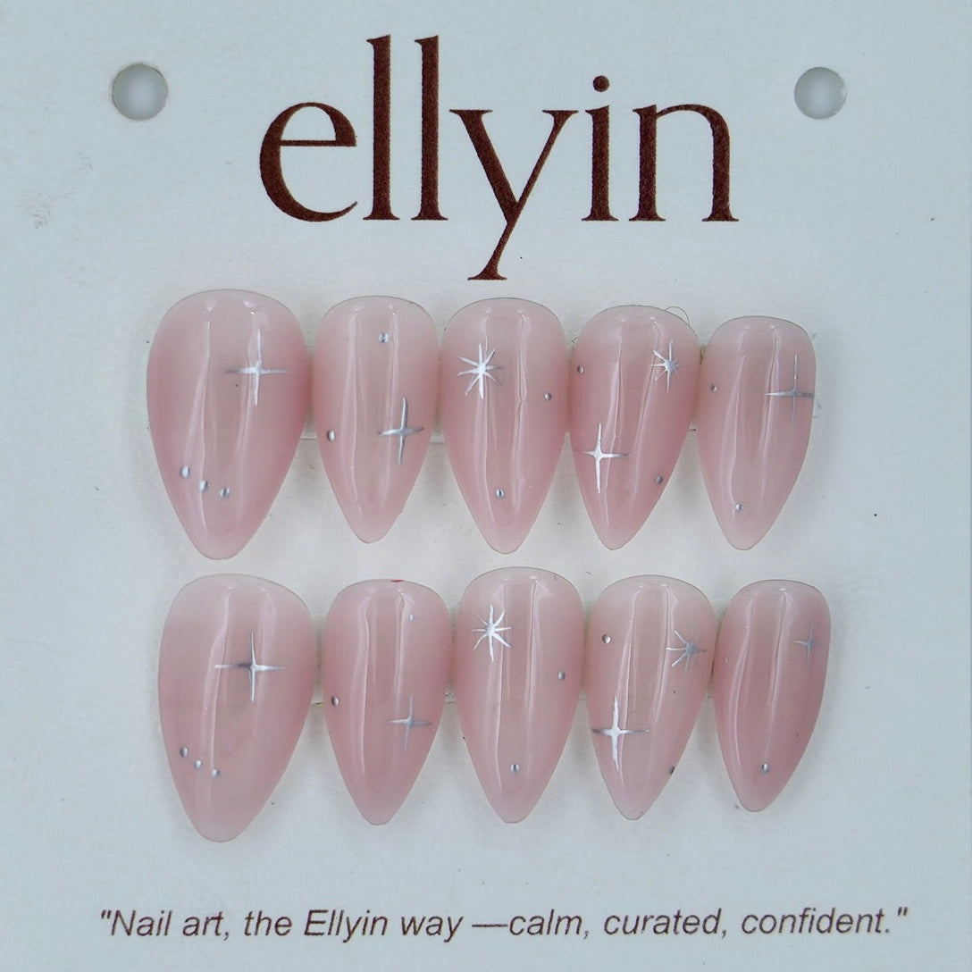 Step into a starlit dream with Naked Galaxy — a celestial-inspired press-on set by Ellyin. Featuring a sheer pink nude base etched with delicate white galaxy motifs, this design radiates subtle magic and modern grace.