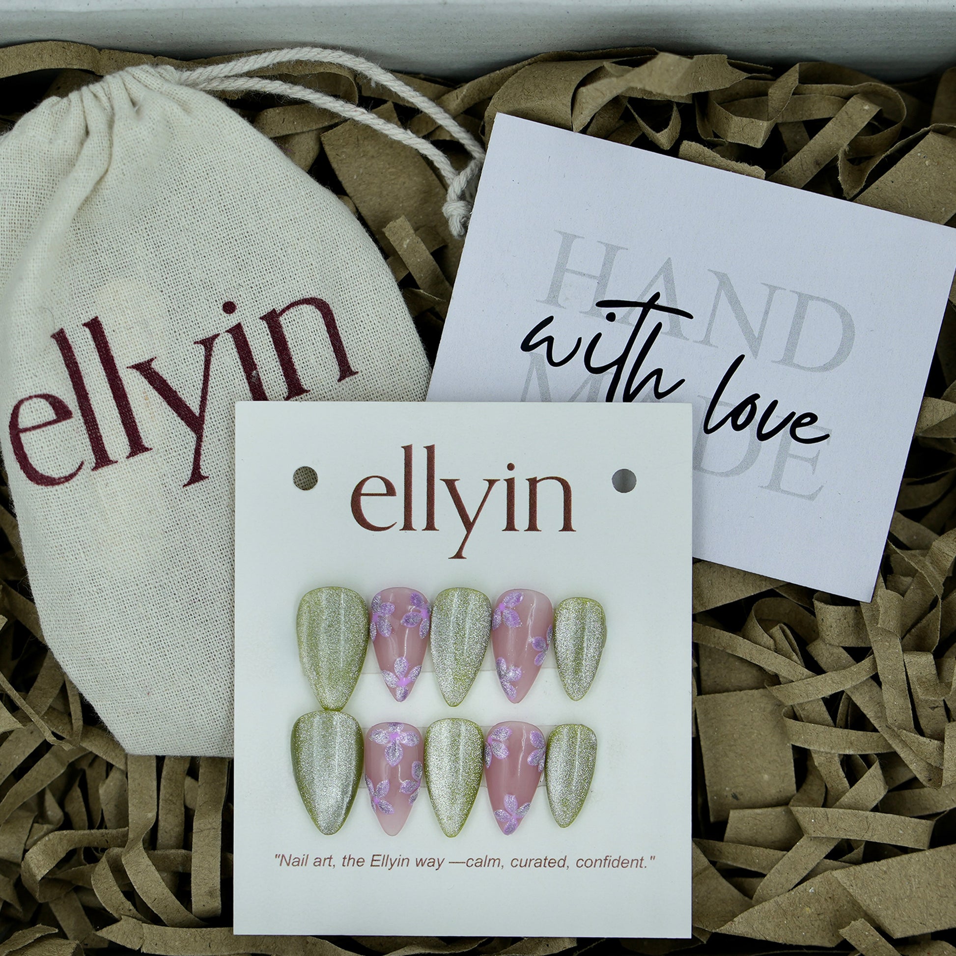 Every Ellyin press-on set is handcrafted by artists — with warmth, care, and detail in every design.