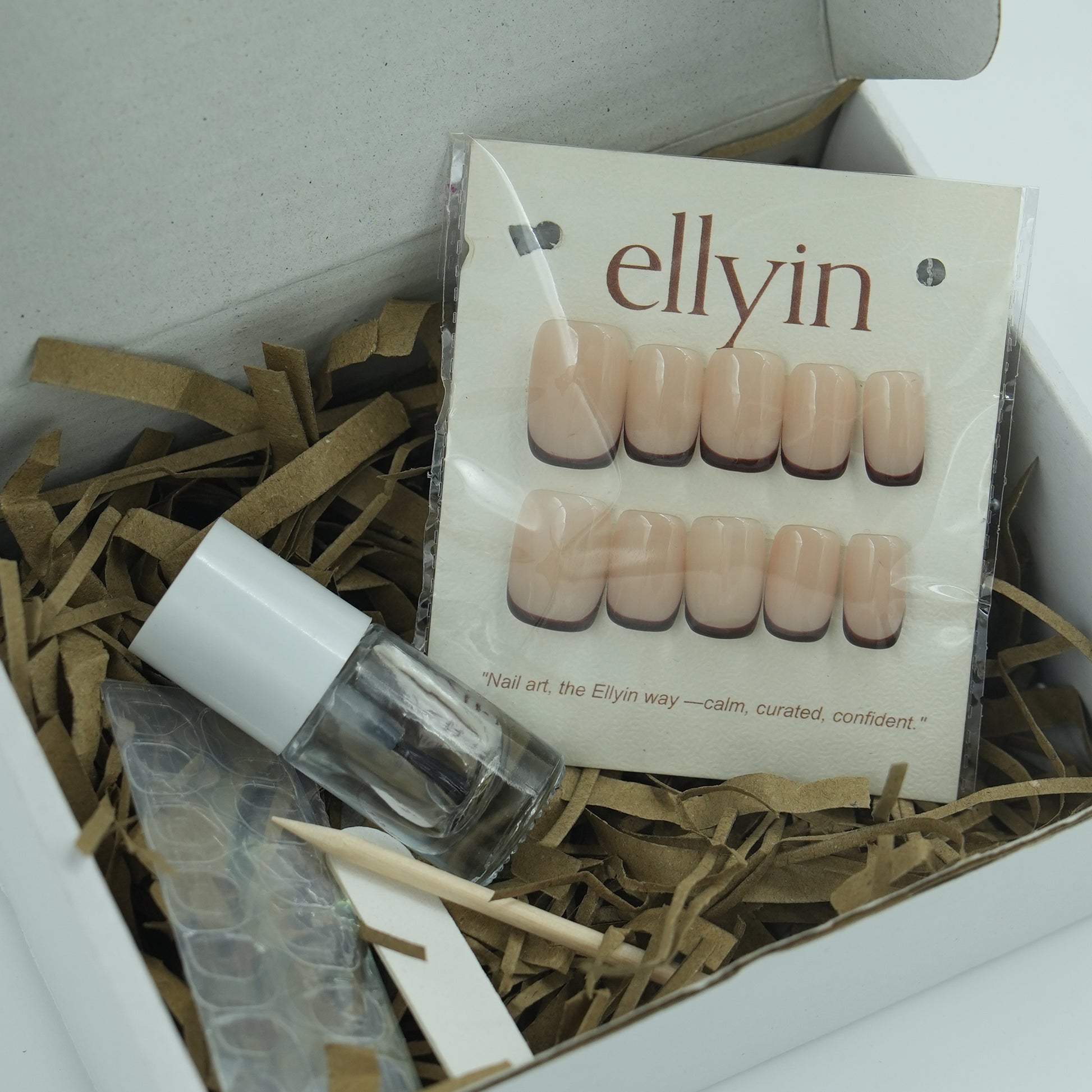 Each Ellyin box includes a complete set of press-on nails, nail glue/adhesive tab, a cuticle stick, mini buffer — all packed with care to make your DIY nail experience smooth and satisfying.