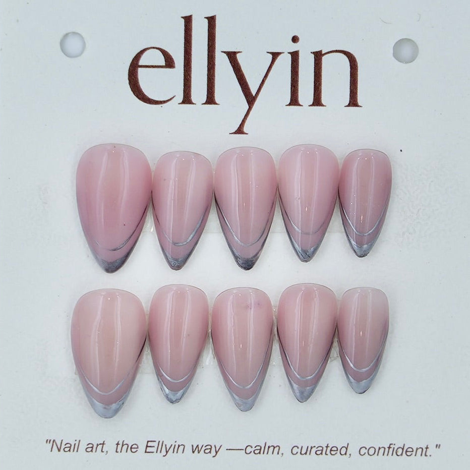 Platinum Edge - A soft blush-nude base meets futuristic chrome tips in Platinum Edge — Ellyin’s take on power-dressing for fingertips. The sleek metallic chevron brings a razor-sharp contrast to the calm base, merging elegance with edge.
