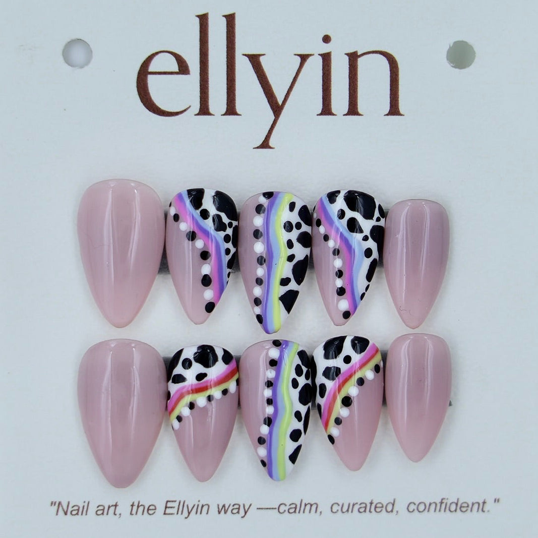 Pop Safari features a nude base brought to life with abstract leopard spots, vibrant stripes, and dotted details in electric hues. It’s bold, fun, and fearless—perfect for days when your nails speak louder than words.