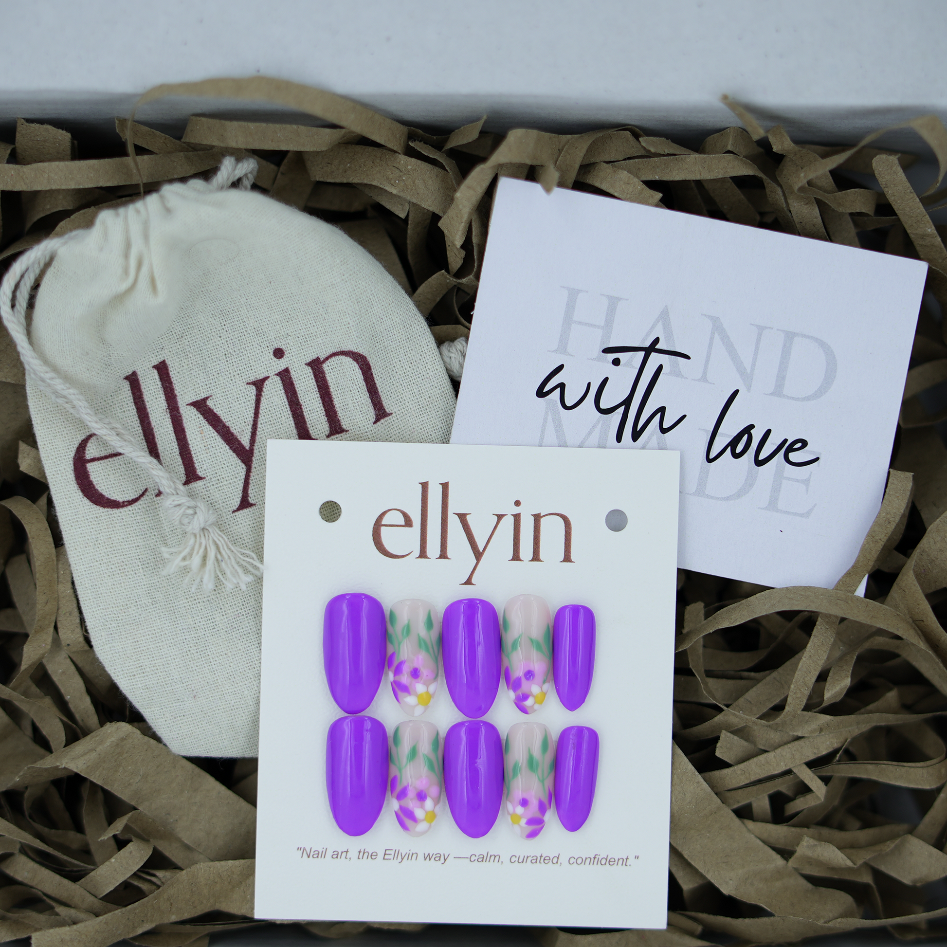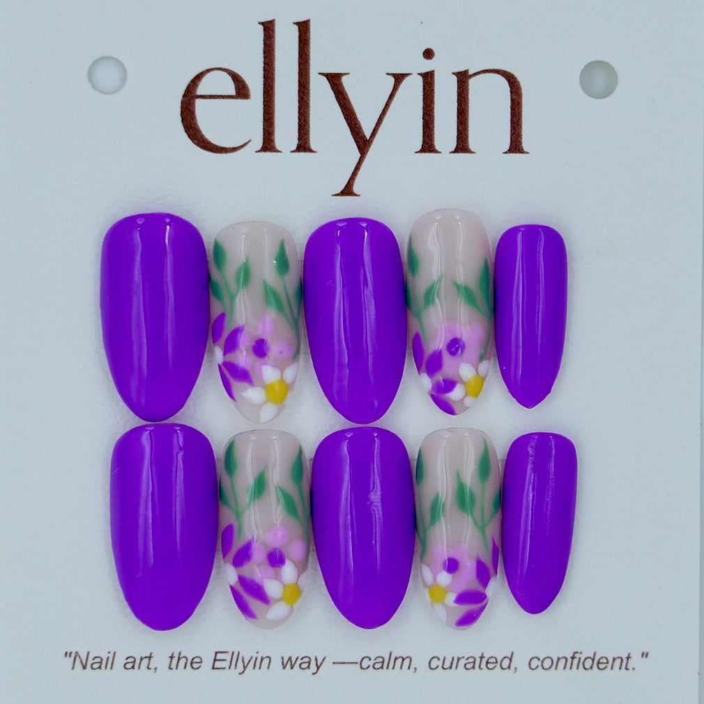 Step into a haze of color with Purple Haze — Ellyin’s striking set that fuses high-impact violet with soft-focus florals. Vibrant purple nails pair with transparent tips blooming with lavender petals, dewy greens, and sunlit yellow centers.