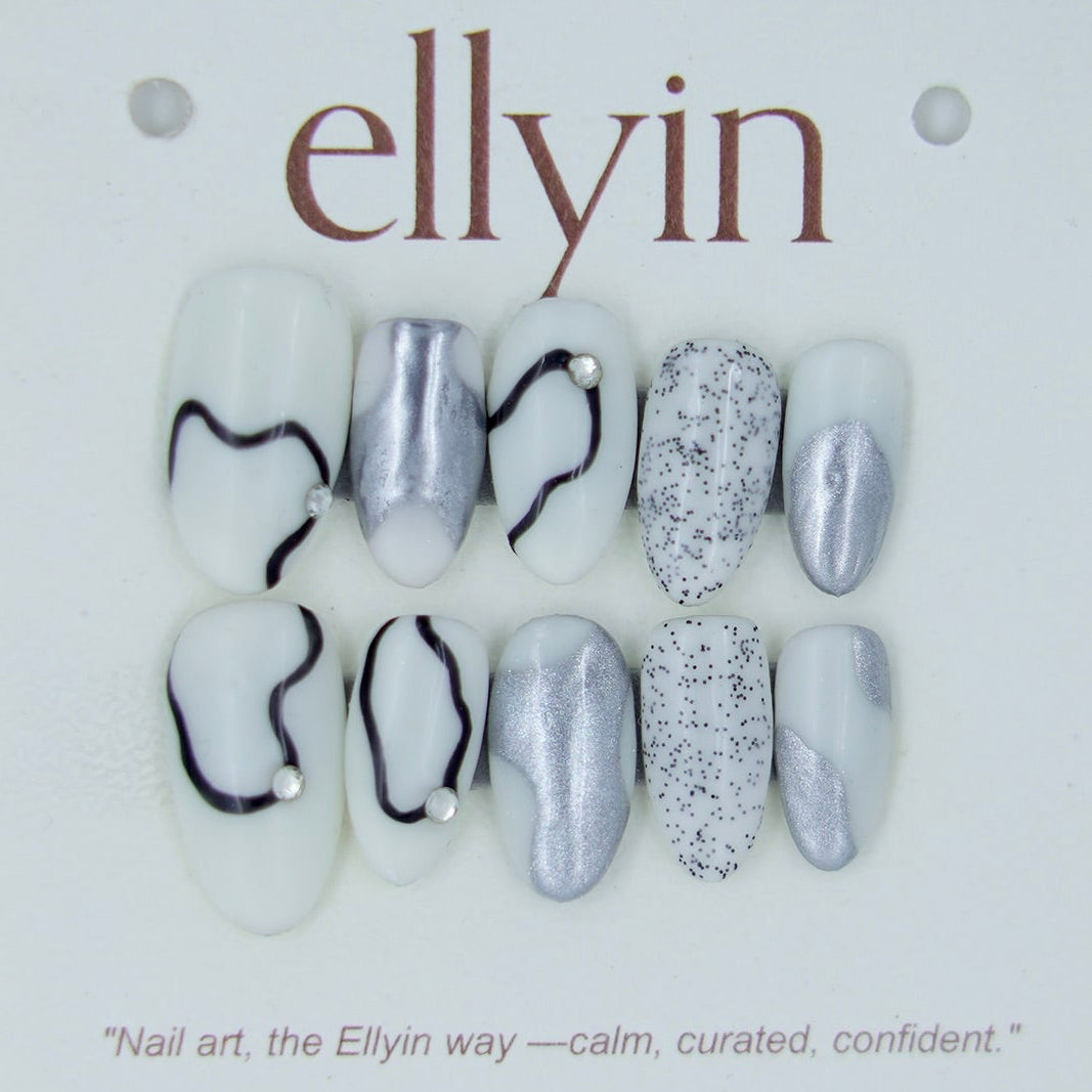 Silver Pulse- Cool mint meets molten silver in this edgy, electrified set that dances between serenity and statement. With abstract black line art, fine glitter shimmer, and icy-blue chrome accents — Silver Pulse delivers an unapologetically modern mood.