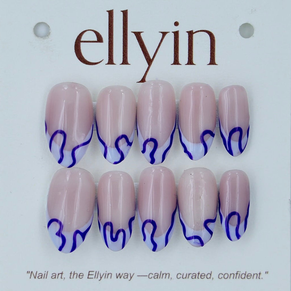 A nude base gets a bold twist with cobalt flame tips in Tipsy Blue — Ellyin’s take on classic meets chaotic. The electric blue accents bring a sense of movement and mood, perfect for days when you want your nails to do the talking.