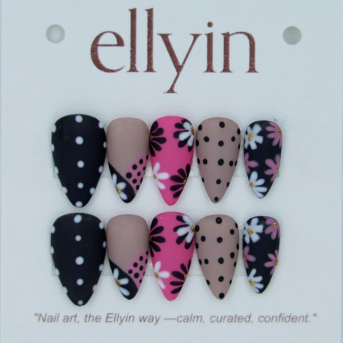 Vintage Bloom Matte black, cocoa beige, and petal pink tones anchor this almond-shaped curation, with each nail bringing a different mood — from flower-power femininity to chic monochrome dots.